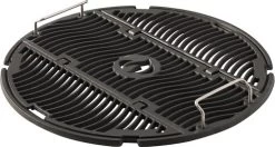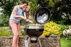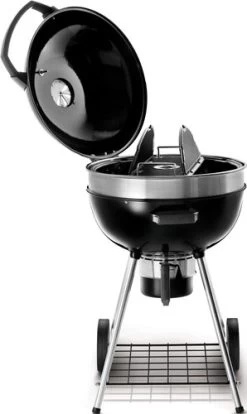 De houtskoolbarbecue heeft geen windscherm waardoor de warmte minder lang blijft hangen en je op lagere temperaturen grilt.